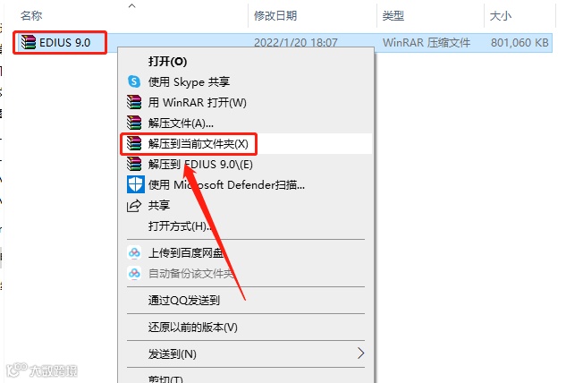 1.下载【EDIUS 9.0】软件安装包,鼠标右击压缩包选择【解压到当前文件夹】。