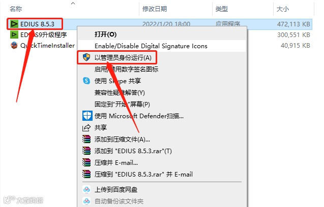 16.返回到解压的【EDIUS 9.0】文件夹中,鼠标右击【EDIUS 8.5.3】安装程序,选择【以管理员身份运行】。
