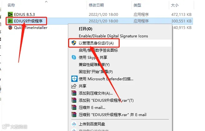 20.返回到解压的【EDIUS 9.0】文件夹中,鼠标右击【EDIUS9升级程序】安装程序,选择【以管理员身份运行】。
