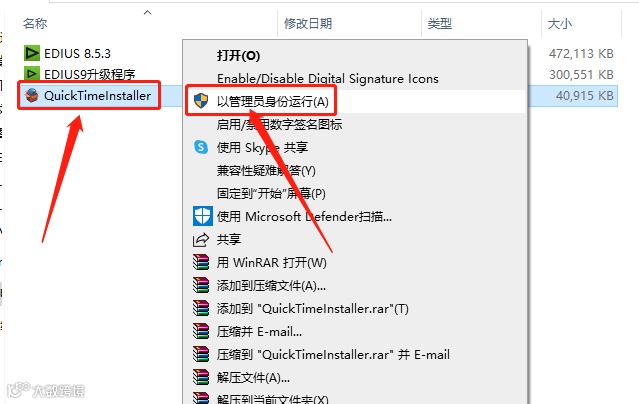 4.鼠标右击【QuickTimeInstaller】,选择【以管理员身份运行】。