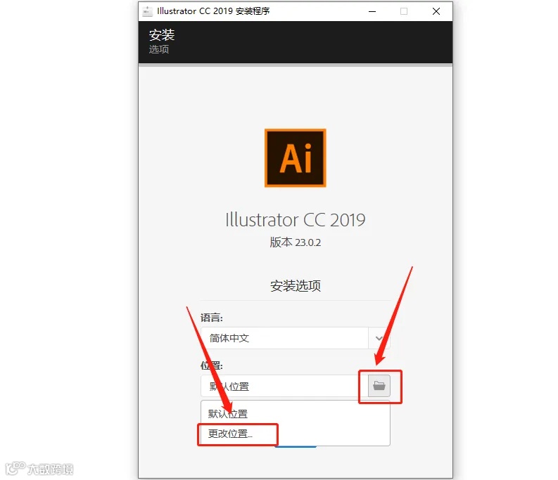 6.点击右下角灰色的小文件夹图标,然后点击【更改位置】设置软件安装路径,此处选择安装到了E盘。