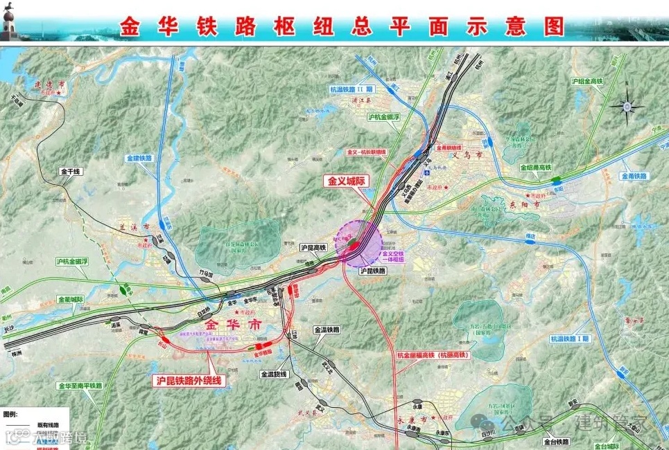 金义综合枢纽是金华市 “三主八辅”铁路枢纽中的主枢纽之一,区域线网规划4条高速铁路,包括沪昆高铁、金义三四线、杭丽高铁、金绍甬高铁。