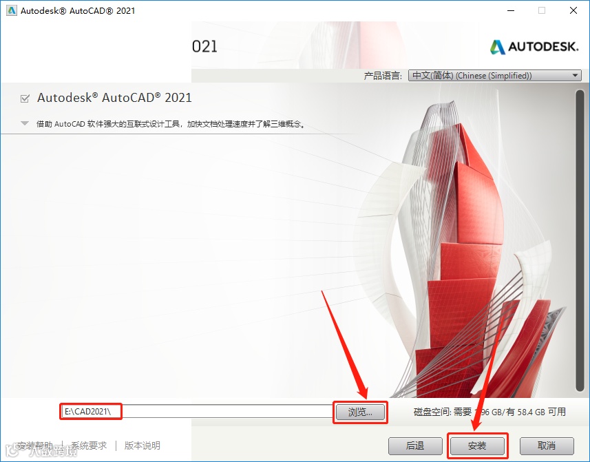 8.点击【浏览】设置CAD软件安装路径,建议安装到除C盘以外的磁盘,可自行设置,设置好安装路径后点击【安装】。