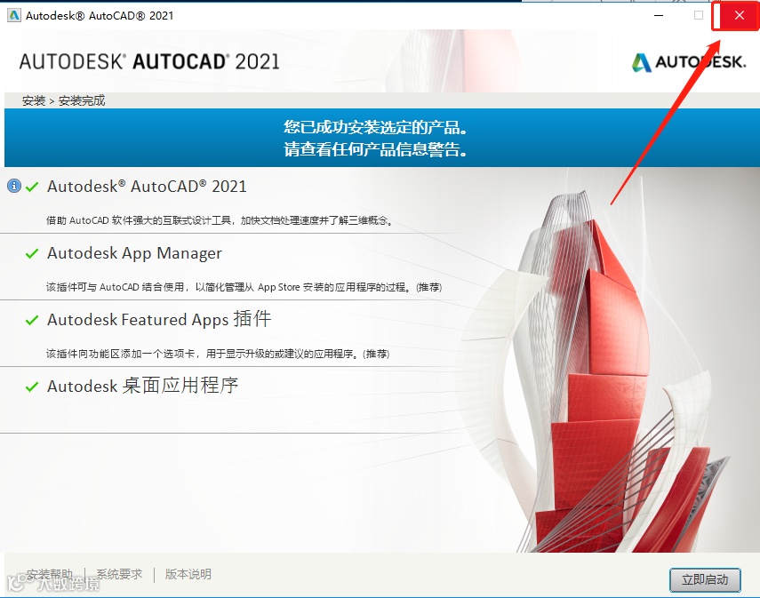 11.安装完成后,在右上角关闭安装界面(切记先不要打开CAD软件)。