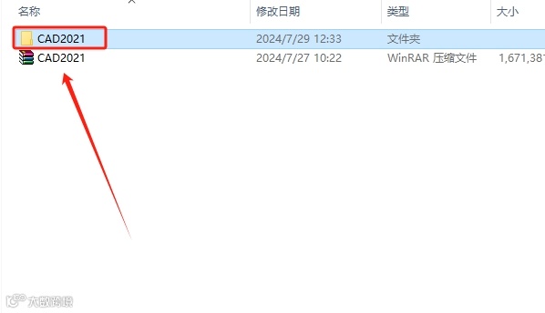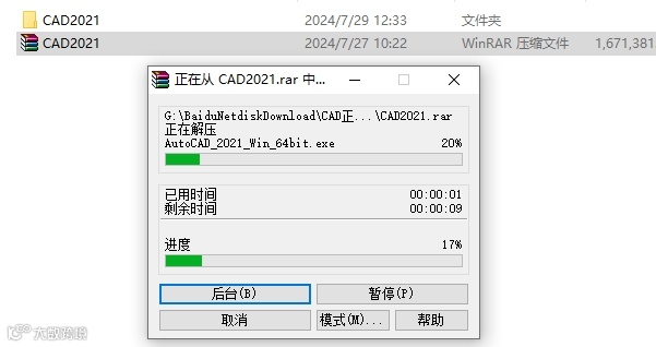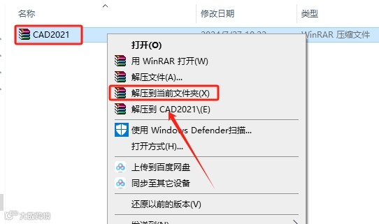 1.下载软件安装包,右击压缩包选择【解压到CAD2021-64bit】,然后等待压缩包解压完成即可。