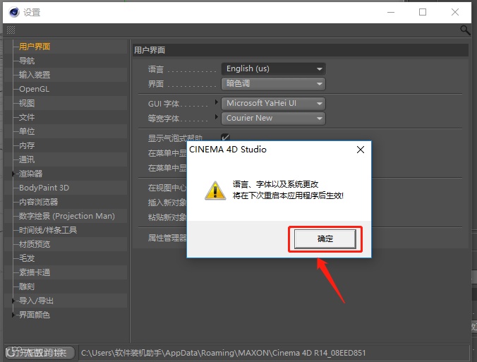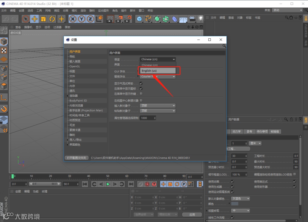 33.【Cinema4D R14】软件中英文切换:软件默认语言为中文,如需英文版,则打开C4D软件,然后按快捷键【CTRL+E】,弹出设置界面,在【Language】中选择【English】。