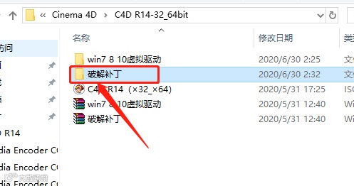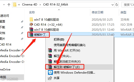 13.返回到【Cinema4D R14】安装包,鼠标右击【破解补丁】压缩包,选择解压到【破解补丁】。