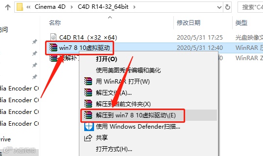 1.下载【Cinema4D R14】软件安装包,鼠标【win7 8 10虚拟驱动】压缩包,选择【解压到win7 8 10虚拟驱动】。