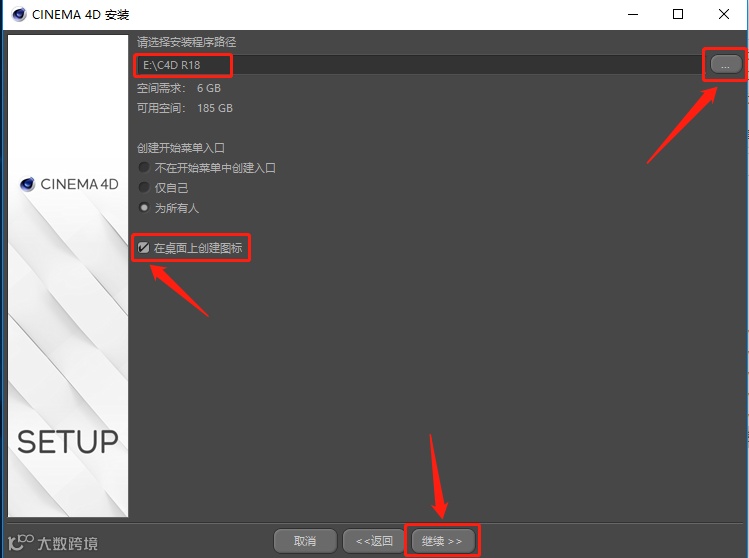 30.勾选【在桌面上创建图标】,然后点击右上方的【···】设置软件安装路径,设置好安装路径后点击【继续】。温馨提示:软件安装的目录不能带中文。