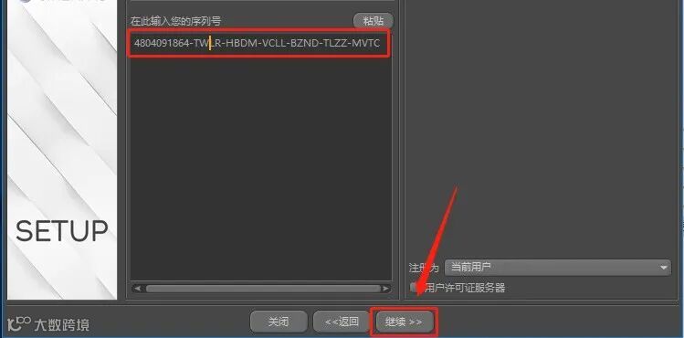 26.任意填写用户注册信息,使用Ctrl+v快捷键粘贴好序列号,最后点击【继续】。