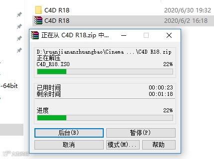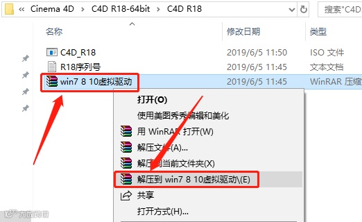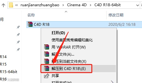 1.下载【Cinema4D R18】软件安装包,鼠标【C4D R18】压缩包,选择【解压到C4D R18】。