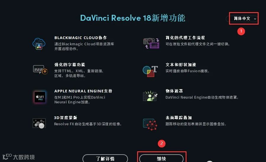 17、右上角语言设置成【简体中文】,再点击【继续】