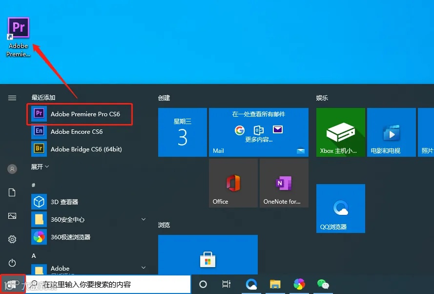 13.开始菜单中找到Pr CS6软件,鼠标拖拽到桌面上即可创建桌面快捷方式。