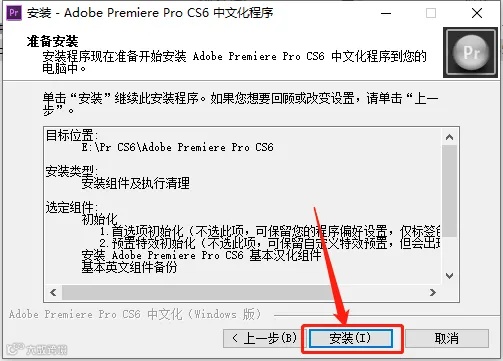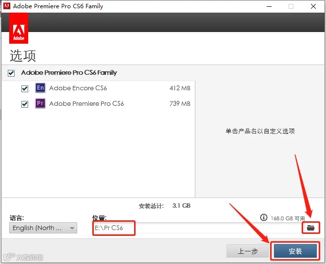 10.点击深灰色的小文件夹图标即可更改Pr CS6的安装路径,用户可自行设置,设置好安装路径后点击【安装】。