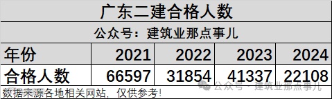 从下表可以看出,2024年的合格人数相较于前几年呈下降趋势,而广东省二建这几年的合格标准是统一的,为总分的50%。
