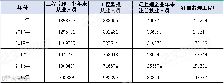 从上表可以看出,监理企业从业人员、工程监理从业人员、注册执业人员是逐年增加的,注册监理工程师人数2018-2019年小幅的下降,2019年-2020年期间有个明显的涨幅。