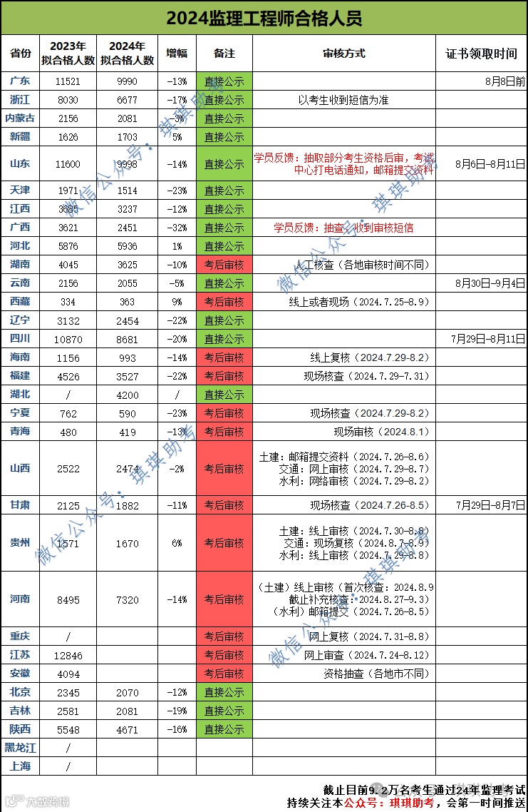 2024年根据目前已有的官方公示合格名单,初步统计已有九万二千人监理考试成绩合格: