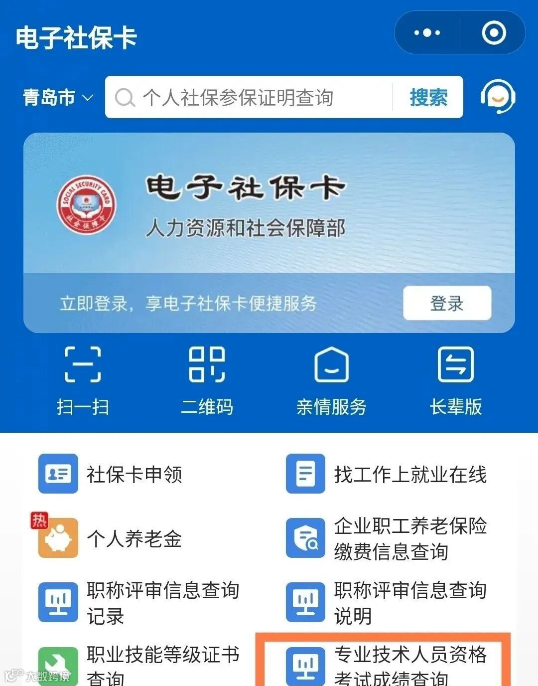 第二步:打开电子社保卡小程序,登录,并点击专业技术人员资格考试成绩查询(人社办事-人才人事-专业技术人员资格考试成绩查询)。