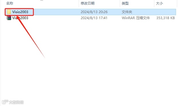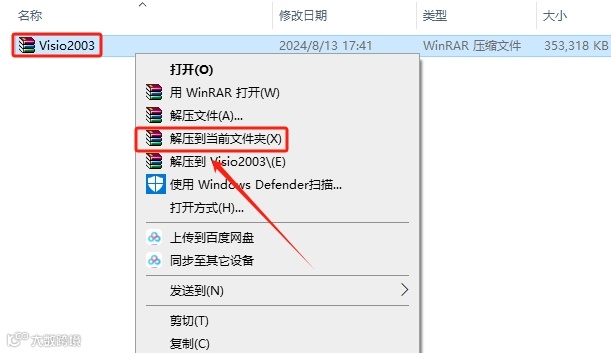 1.打开Visio2003安装包,鼠标右击压缩包,选择【解压到当前文件夹】。