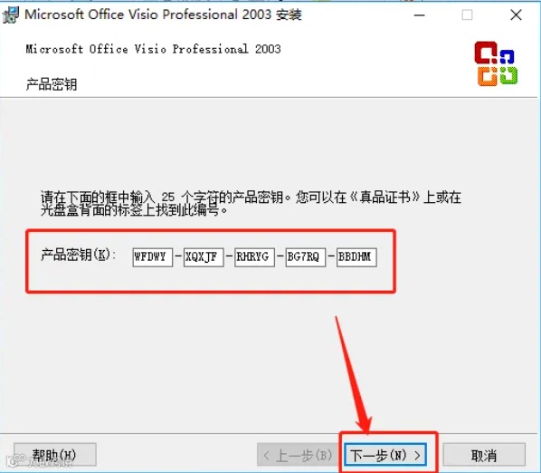 6.输入产品密匙:WFDWY-XQXJF-RHRYG-BG7RQ-BBDHM,然后点击【下一步】。
