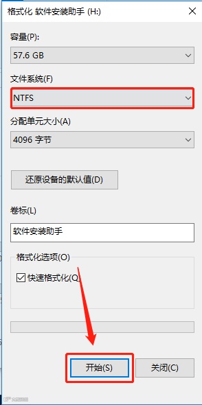 3.在“文件系统处”选择“NTFS”,然后点击“开始”,等待格式化完成。