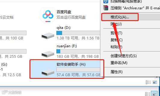 2. 鼠标右击插入的U盘,选择“格式化”。
