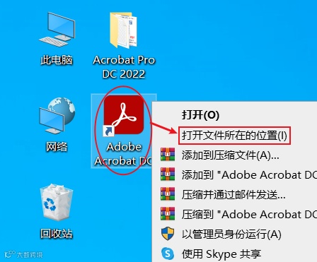 10、返回到桌面,鼠标右击【Adobe Acrobat Pro DC】图标选择【打开文件所在位置】;