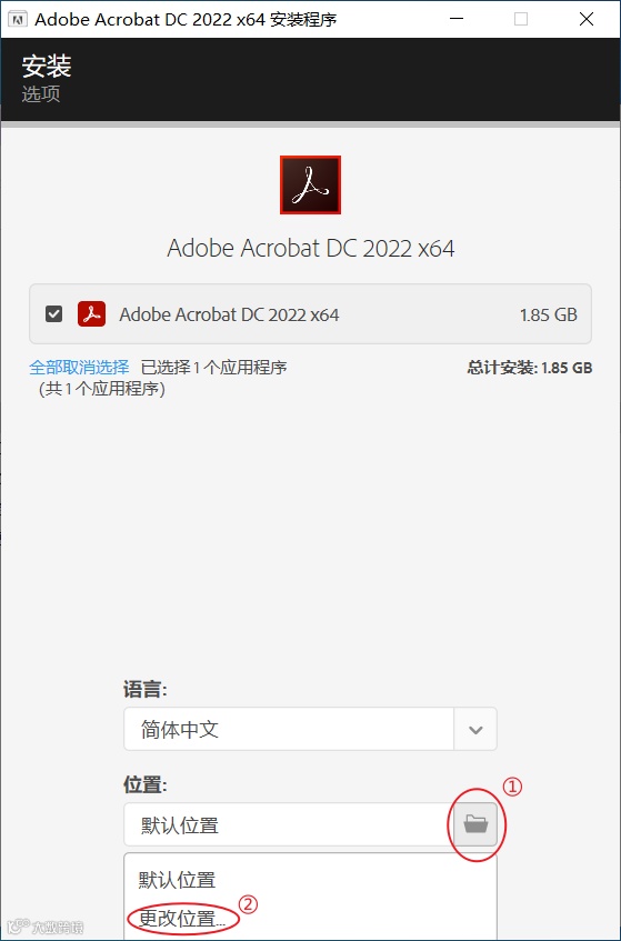 4、修改安装路径:①点击文件夹图标,②点击【更改位置】(默认位置是安装在C盘,建议修改到其它盘进行安装,如要安装在默认位置,直接点击【继续】即可);