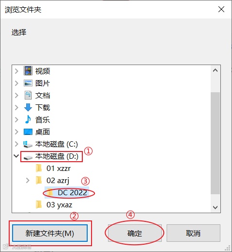 5、①点击要安装位置的磁盘目录,②点击【新建文件夹】,③命名【DC 2022】,④点击【确定】;