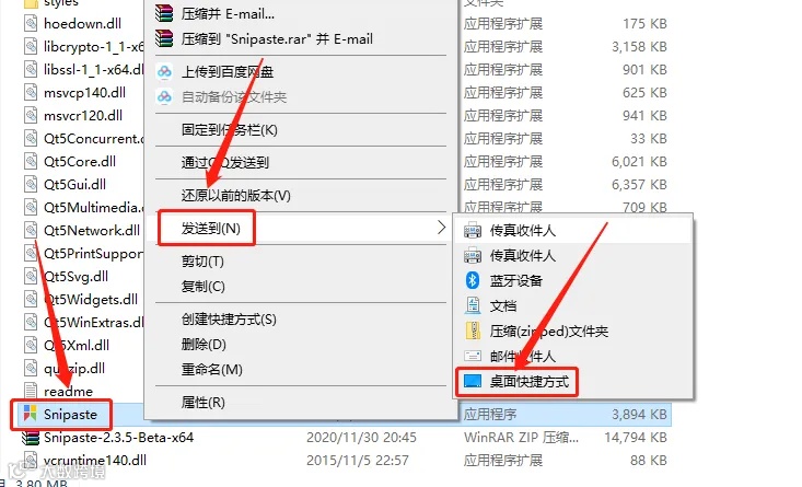 3.鼠标右击【Snipaste】,点击【发送到----】,点击【桌面快捷方式】。