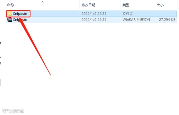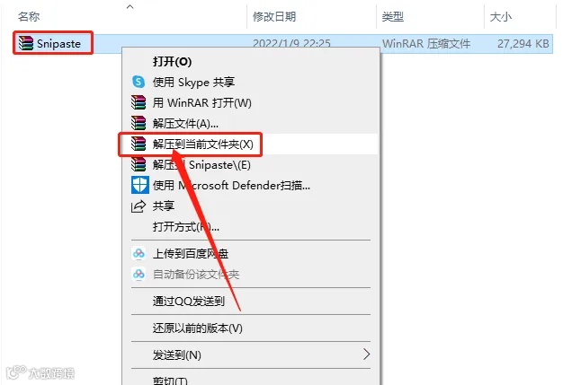 1.打开Snipaste软件安装包,右击压缩包选择【解压到当前文件夹】。