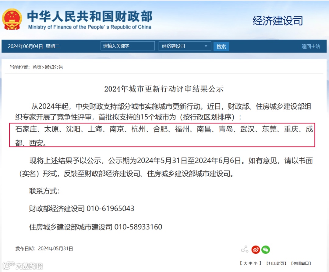 5月31日,住建部、财政部联合发布《2024年城市更新行动评审结果公示》。
