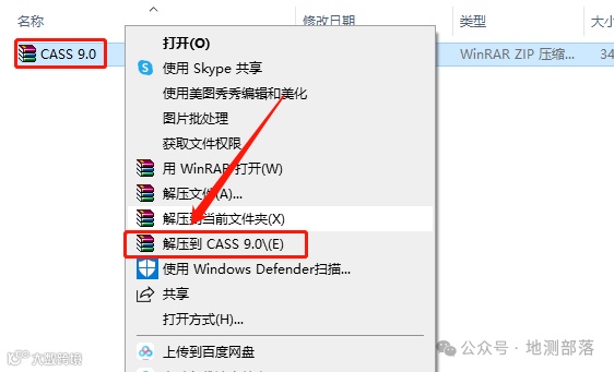 1.下载软件安装包,鼠标右击【CASS 9.0】压缩包,选择【解压到CASS 9.0】。