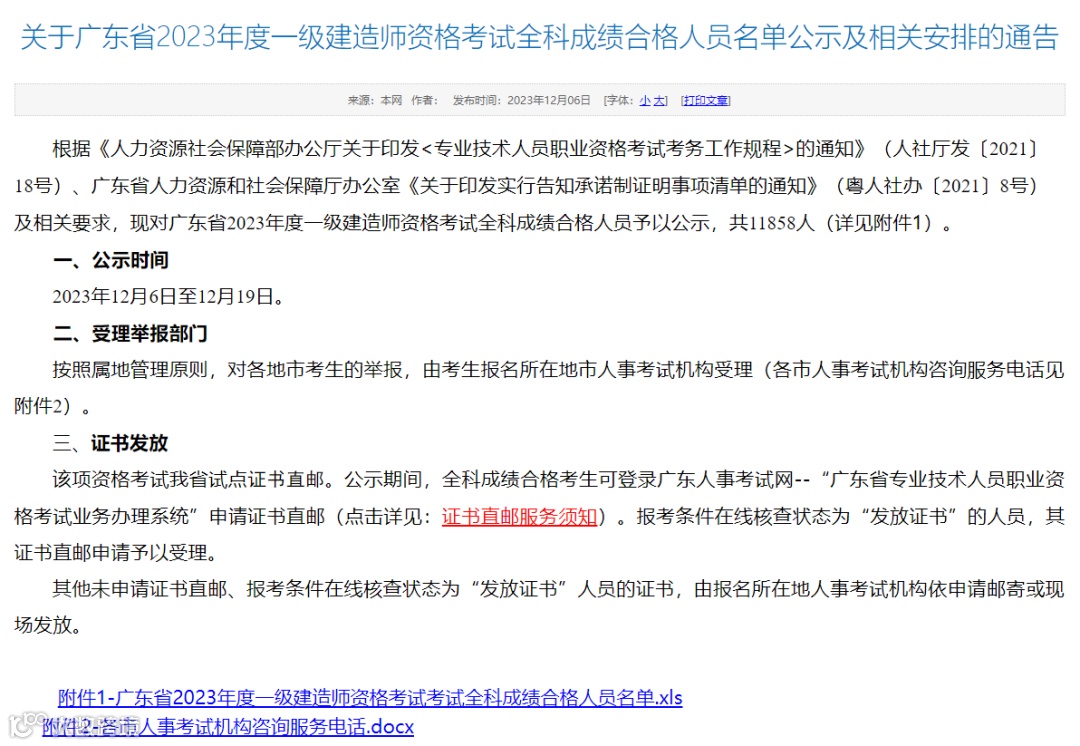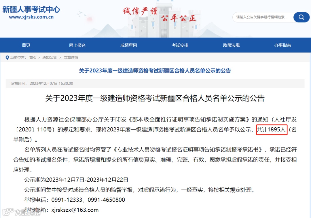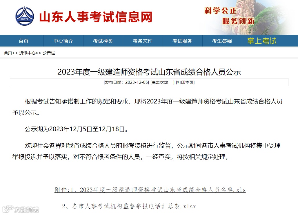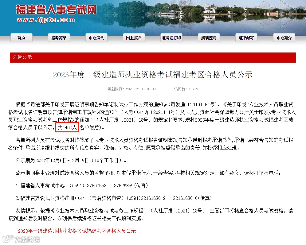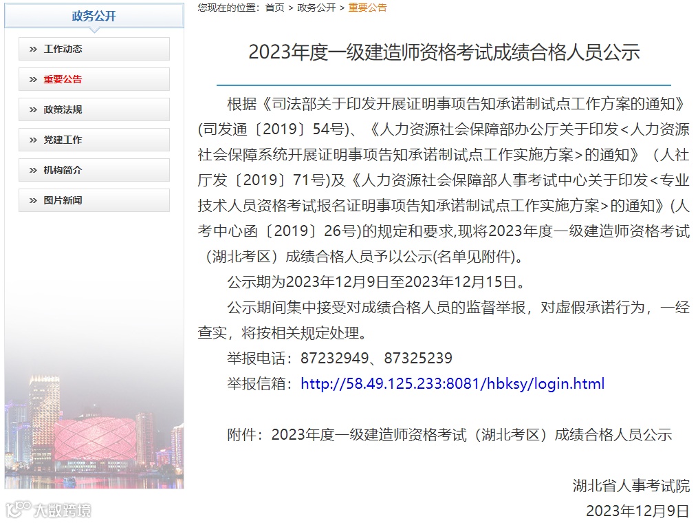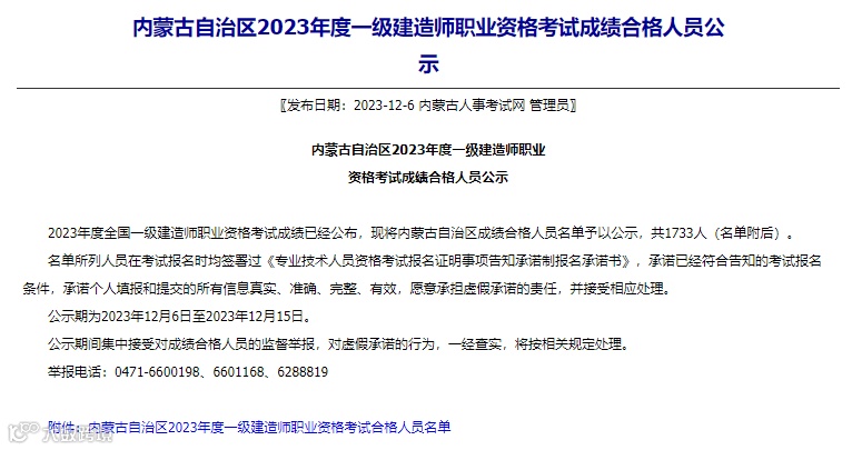 现对2023年度一级建造师执业资格考试成绩合格人员(见附件1)予以公示,接受社会监督。公示期为2023年12月11日至2023年12月22日。公示期间,集中接受对成绩合格人员的监督举报(举报电话见附件2),对不符合考试报名条件或提供虚假证明材料骗取报名资格的,一经查实,将按相关规定处理。