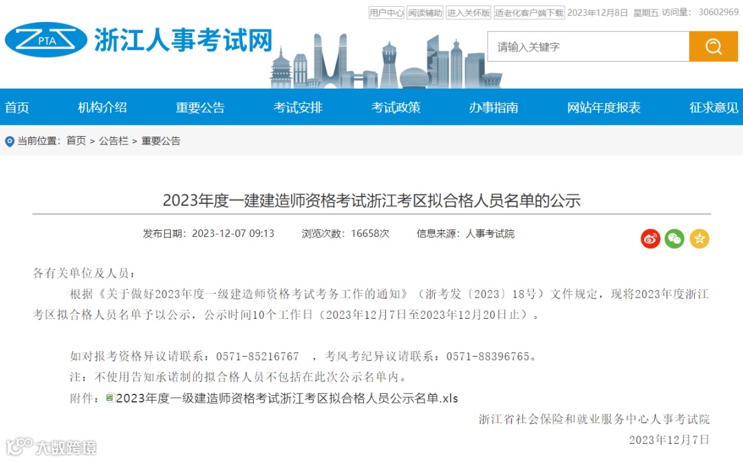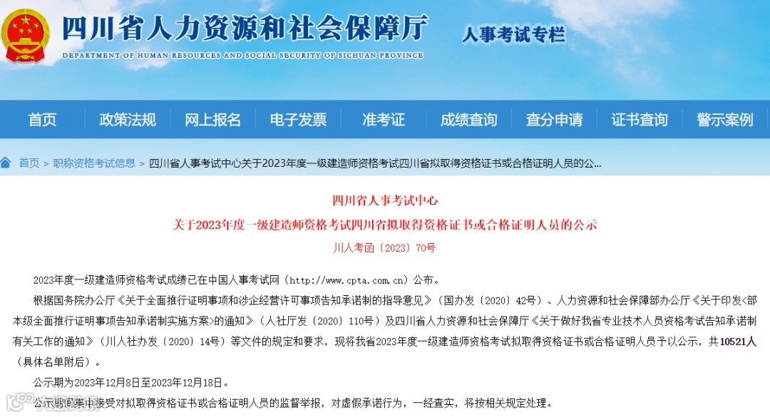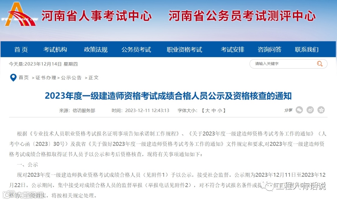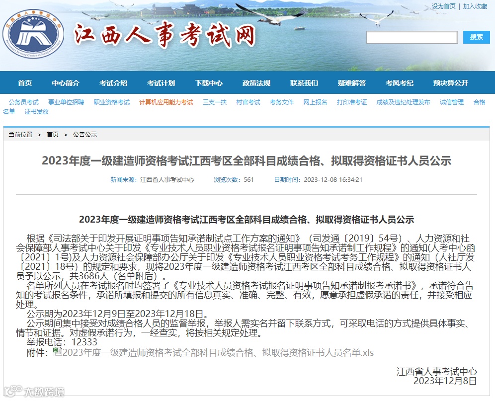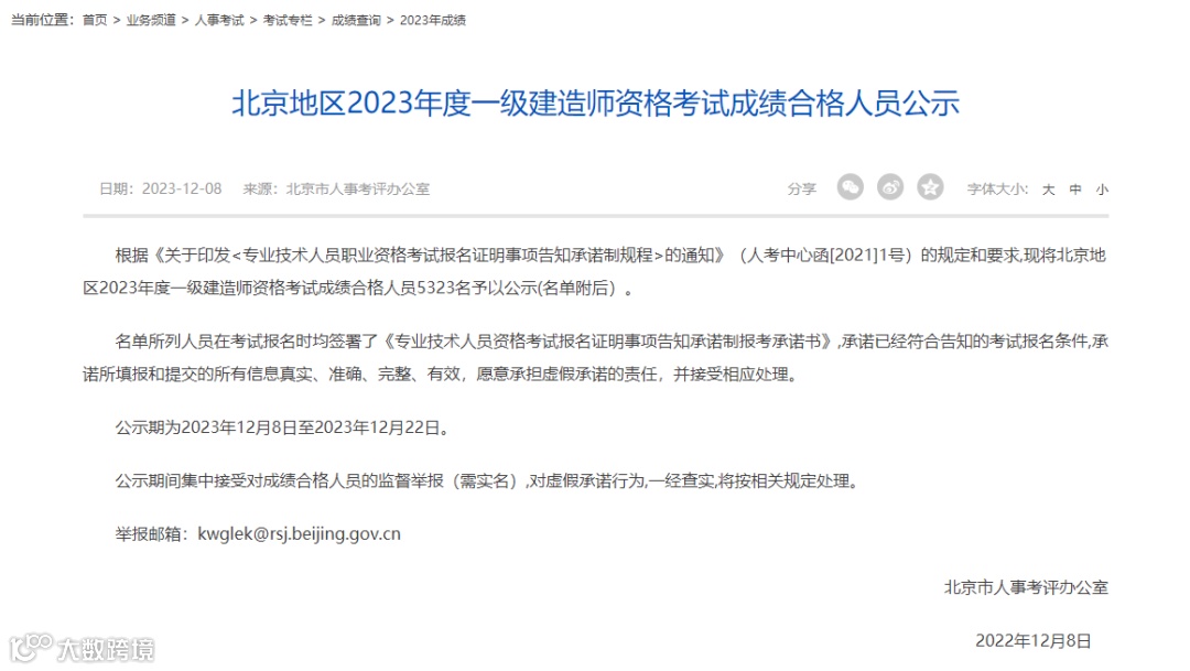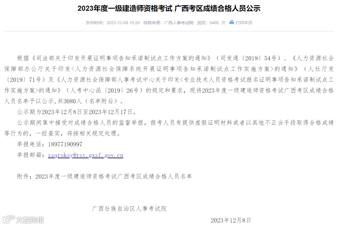 现对2023年度一级建造师执业资格考试成绩合格人员(见附件1)予以公示,接受社会监督。公示期为2023年12月11日至2023年12月22日。公示期间,集中接受对成绩合格人员的监督举报(举报电话见附件2),对不符合考试报名条件或提供虚假证明材料骗取报名资格的,一经查实,将按相关规定处理。