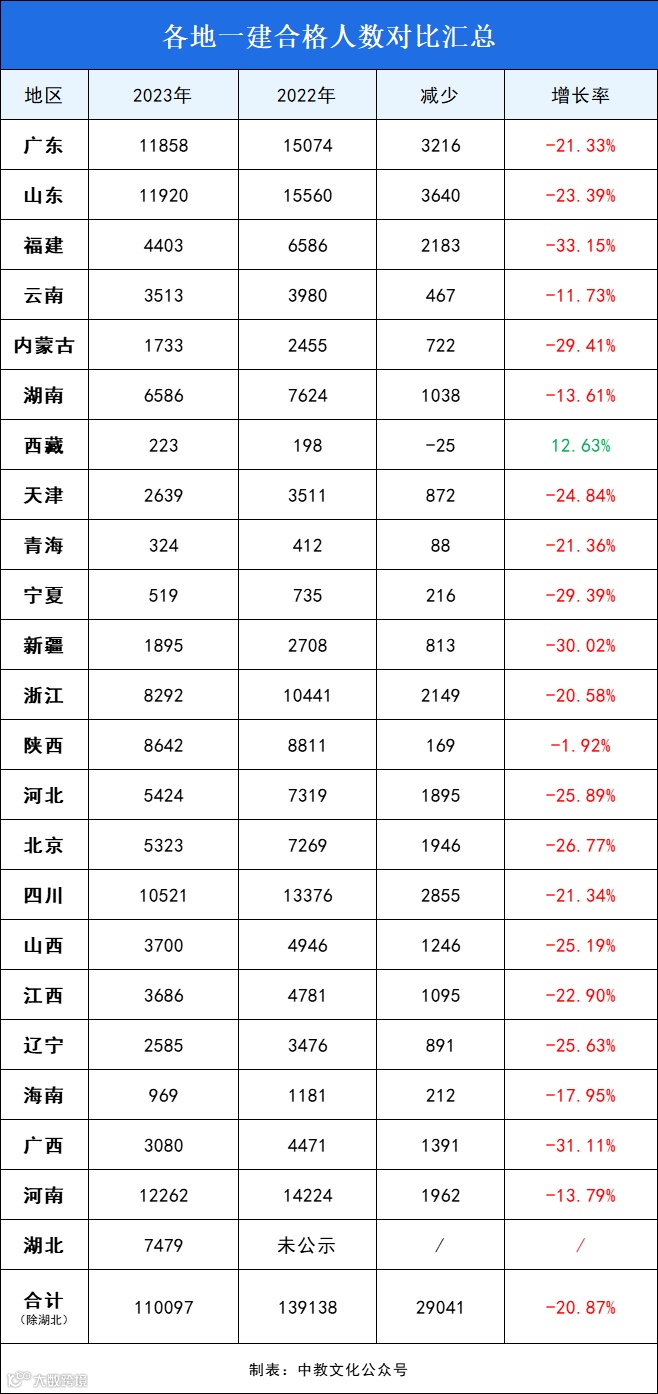 2023年一建成绩公布后,截至目前已有23地发布合格人数。对比去年,除西藏上涨外,其他省份合格人数均下降10%~30%左右