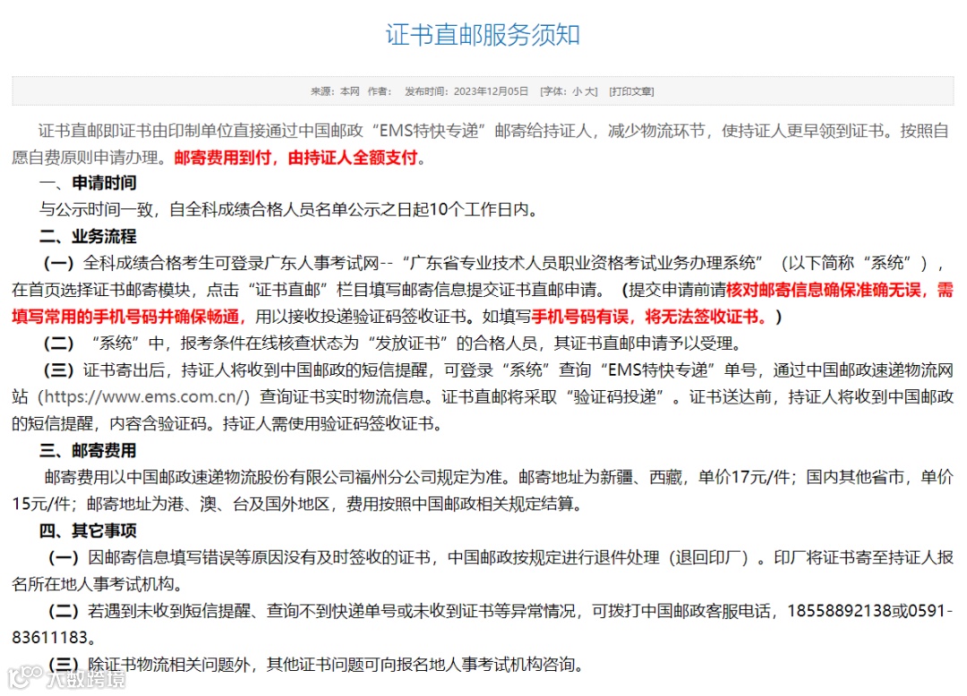 资格核查结果公布后,方可申请证书获取,证书制发、邮寄等按国家要求时间执行,请耐心等待。纸质证书和电子证书均由国家制发。电子证书可登录中国人事考试网“证书查验-证书下载”查看下载。纸质证书可通过邮寄或现场两种方式进行领取,邮寄领取办法详见附件3,未选择邮寄领取的人员请等待通知现场领取。