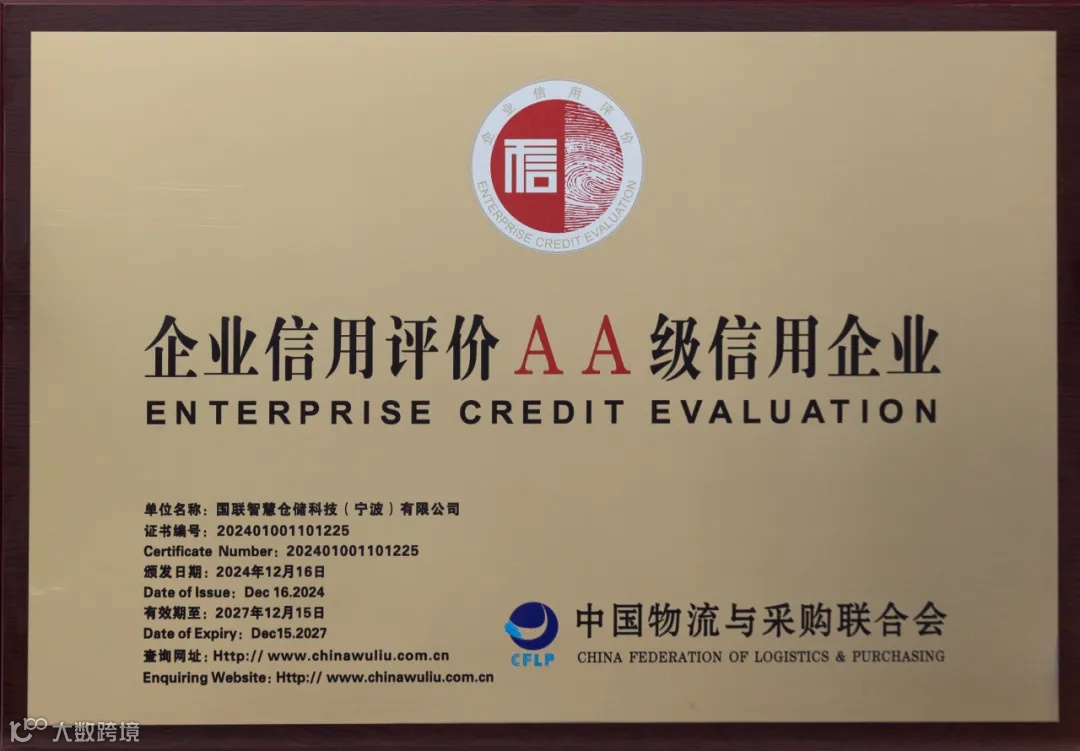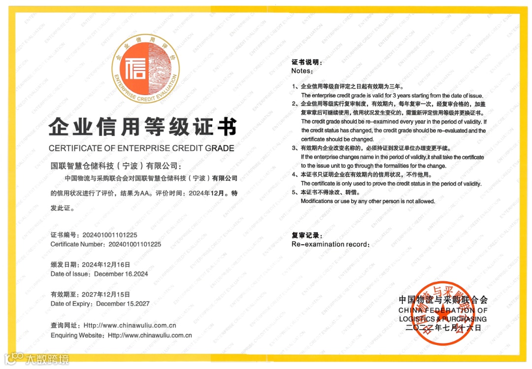 国联智慧仓储科技(宁波)有限公司获评“企业信用评价AA级信用企业”