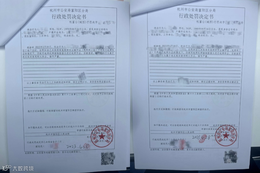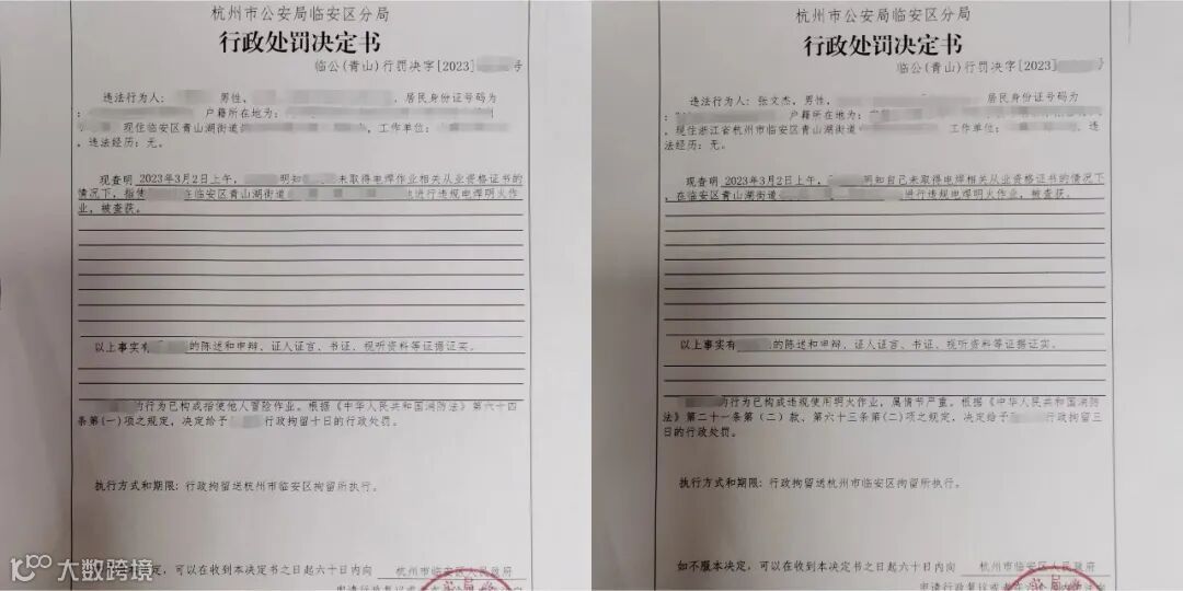 无独有偶,前不久,杭州临安、富阳等地也处罚了多名无证电焊工人。