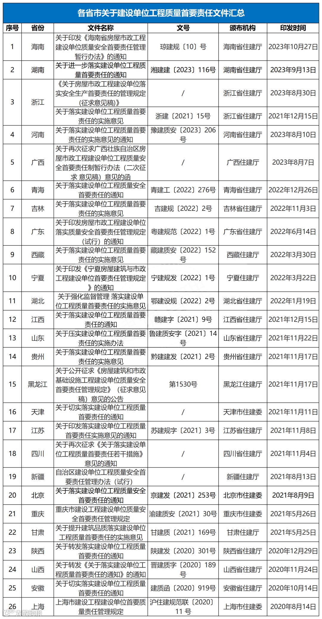 截至目前,26省市发文跟进住建部《关于落实建设单位工程质量首要责任的通知》(建质规〔2020〕9号),严格落实建设单位工程质量首要责任。