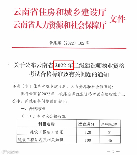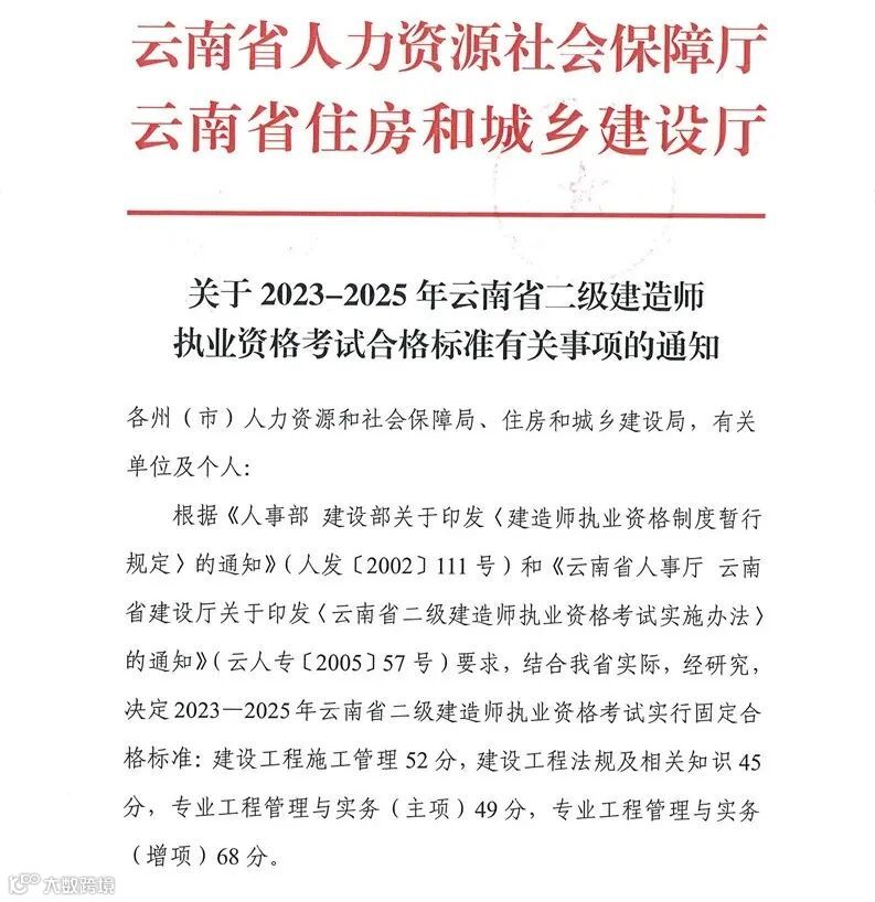 无独有偶,云南也直接定下了23年-25年的合格标准,管理52分,法规45分,实务主项49分,实务增项68分。