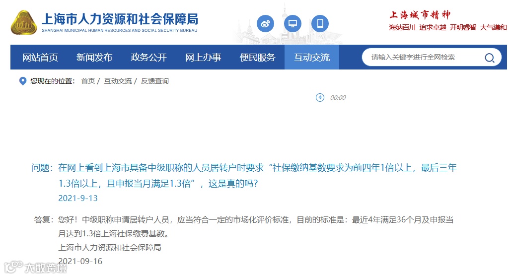 上海市人社局对持有《上海市居住证》人员申办本市常住户口政策中,关于“中级职称”条件的具体要求和社保等问题,做出统一回复!