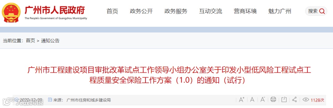 广州市《关于印发小型低风险工程试点工程质量安全保险工作方案(1.0)的通知(试行)》自2021年1月1日开始执行,广州市以下项目试点不再实行监理: