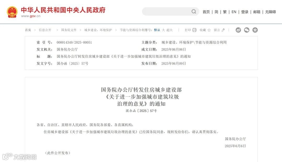 6月6日,国务院办公厅转发住房城乡建设部 《关于进一步加强城市建筑垃圾治理的意见》 ,明确提出到2027年,全国地级及以上城市建筑垃圾平均资源化利用率要达到50%以上,基本形成城市建筑垃圾有效治理新格局。
