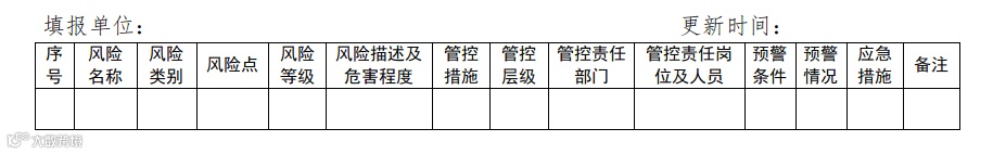 铁路单位结合实际建立本单位统一的风险库,主要包括风险名称、风险类别、风险点、风险等级、风险描述及危害程度、管控措施、管控层级及部门、管控岗位及责任人等内容。