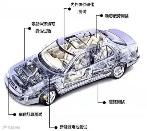 零部件环境可靠性试验、内外饰件理化测试、管路试验、动态疲劳测试、车辆灯具测试、新能源电池测试;