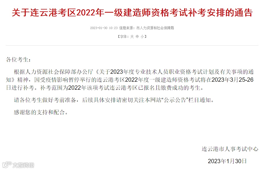1月30日,连云港市人事考试中心发布《关于连云港考区2022年一级建造师资格考试补考安排的通告》,原文如下: