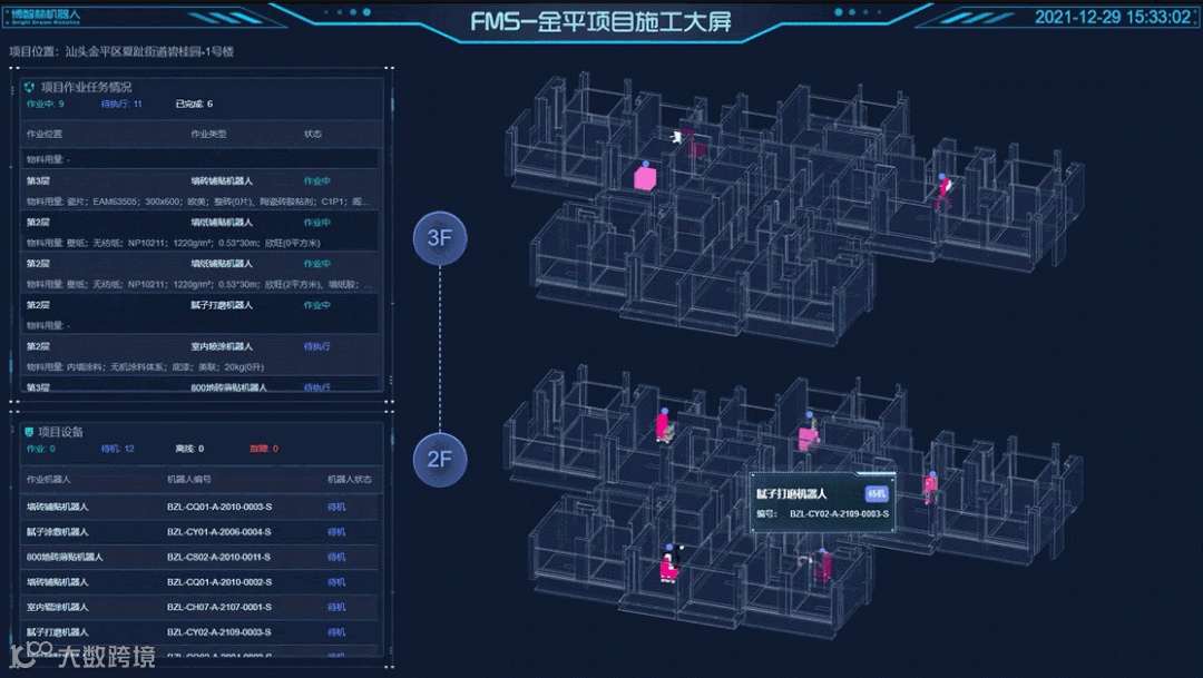 2021年12月30日,碧桂园集团旗下博智林在汕头金平项目悄悄干了一件大事:首次完成“BIM+FMS+WMS+建筑机器人多机施工系统”的验收!碧桂园建筑机器人再度取得重大突破,向智能建造目标又迈进了一大步!
