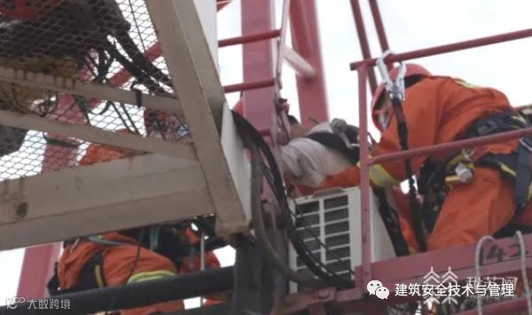 消防人员和工友一起爬上塔吊,发现工人在操作室外面的站台上躺着,全身抽搐,人无法动弹。在工友的帮助下,消防人员为其穿戴上防护吊带,一起进入料斗,再由专业人员操作,缓慢下降,10多分钟后顺利将其送到地面。