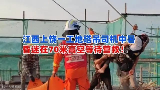 8月15日下午,江西省上饶市一建筑工地有塔吊司机因中暑昏迷被困高空,消防救援人员到达现场后发现,被困者位于高空中的塔吊驾驶室内,且已经进入昏迷状态,浑身无力,被困在操作室里无法动弹,通信员立即联动120急救人员到达现场。由于塔吊驾驶室距离地面有70多米高,且救援空间狭小,消防救援人员决定在为被困司机穿戴好救援装备后,利用绳索将其下滑至平台。在被困司机到达至平台楼顶时,地面接应的救援人员立即将被困人员转移至阴凉处,并对被困司机进行救护,经过40多分钟紧急救援,塔吊司机逐渐恢复正常。